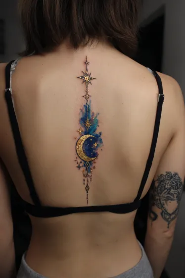 Honestly, I m absolutely smitten with how magical this tattoo feels. The combination of the deep blues and shimmering golds creates such a luxurious and ethereal vibe, like a piece of the night sky brought to life on your skin. It s such a dreamy design that perfectly highlights the natural curve of the spine, and I think it would make anyone feel like they re carrying a little piece of cosmic wonder with them every day.