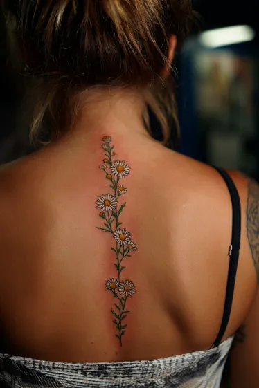 This exquisite tattoo showcases a delicate trail of daisies gracefully ascending the spine. Each bloom, with its bright white petals and sunny yellow center, is intricately detailed, creating a beautiful and organic flow. The vibrant green stems and tiny budding flowers add a touch of fresh growth, making the entire piece feel alive and wonderfully natural. It s a truly lovely example of how a floral design can perfectly complement the elegance of the spine s natural curve.
