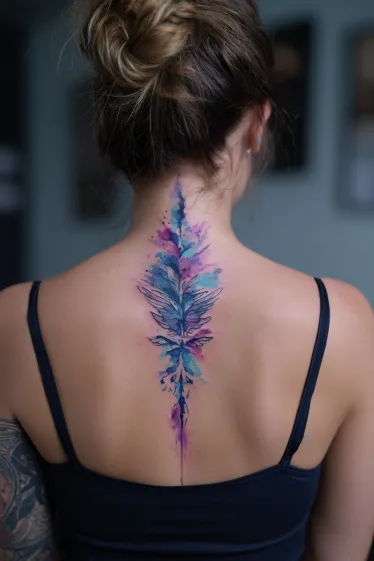 This captivating tattoo features a beautifully rendered feather-like design, dramatically flowing down the spine with an enchanting watercolor effect. It showcases a stunning blend of vibrant blues, serene purples, and soft pinks, all seamlessly melting into one another to create a fluid and artistic statement. The delicate lines within the feather suggest an intricate structure, while the surrounding colorful splashes add to its dreamy and ethereal charm, perfectly following the natural curve of the back.
