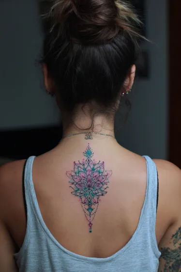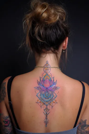 This absolutely stunning spine tattoo features a vibrant lotus flower at its heart, blooming in gorgeous shades of pink and purple, surrounded by intricate mandala patterns. Delicate geometric designs in teal and blue extend gracefully from the lotus, creating a symmetrical and flowing artwork that beautifully highlights the spine s natural line. The fine details and thoughtful color placement give this piece a truly harmonious and captivating look.