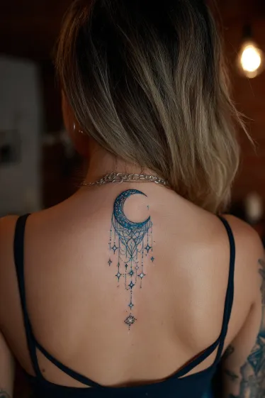 This enchanting tattoo features a beautifully rendered crescent moon, intricately filled with delicate blue mandala-like patterns and subtle sparkling accents, positioned at the top of the design. Dangling gracefully below it is a cascade of sparkling stars and elegant geometric shapes, all in varying shades of blue, creating a mesmerizing effect that draws the eye down the spine. The entire piece has a dreamy, ethereal quality, perfectly aligning with the natural curve of the back.