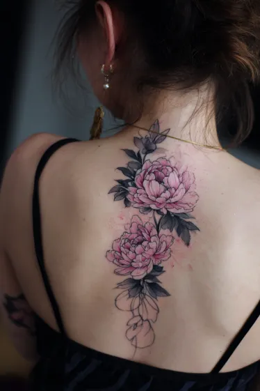 This exquisite spine tattoo features a stunning vertical arrangement of soft pink peonies, beautifully rendered with delicate shading and vibrant pops of color. Darker, almost charcoal-colored leaves provide a lovely contrast to the blossoms, while hints of watercolor splashes in rosy tones add a dreamy, artistic touch. Towards the bottom, the design subtly transitions into delicate, unfinished line work, giving it a wonderfully organic and flowing feel as it gracefully trails down the back.