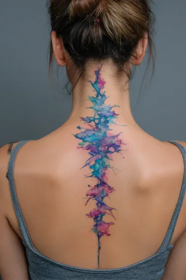 This incredibly striking tattoo is a masterpiece of abstract watercolor, featuring a dynamic burst of vivid colors that dramatically flows down the spine. You can see splashes and streaks of brilliant pinks, deep purples, and stunning blues and teals, all blending together seamlessly to create an energetic and fluid effect. It truly looks like a vibrant painting come to life, gracefully embracing the natural line of the back.