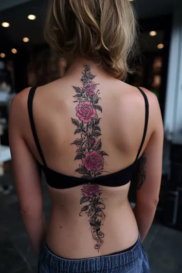 This beautiful spine tattoo showcases a lush trail of blooming pink roses and budding blossoms, gracefully winding down the back. Each rose is detailed with soft pink petals and intricate shading, while the surrounding green leaves add depth and natural appeal to the design. The entire piece creates a vibrant and flowing botanical statement that really captures the eye.