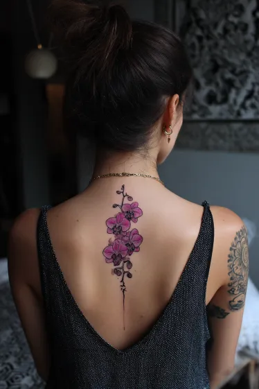 I absolutely adore how this orchid tattoo captures such a sense of refined beauty and femininity. The rich purple hues are just breathtaking, and the way the flowers seem to gently unfurl along the spine is simply captivating. It s such a sophisticated yet delicate choice, and I think it would make anyone feel incredibly chic and connected to nature s exquisite artistry.