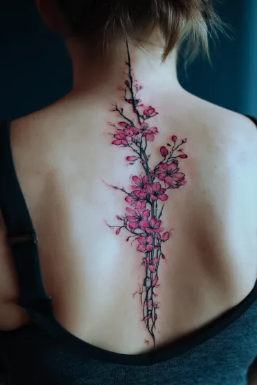 This enchanting tattoo features a graceful branch adorned with vibrant pink blossoms and budding flowers, elegantly winding its way down the entire length of the spine. The delicate petals are rendered with a beautiful watercolor-like softness, while the contrasting dark branches and subtle hints of leaves give the design a natural, artistic flair. It perfectly captures the ephemeral beauty of spring in a stunning vertical arrangement.