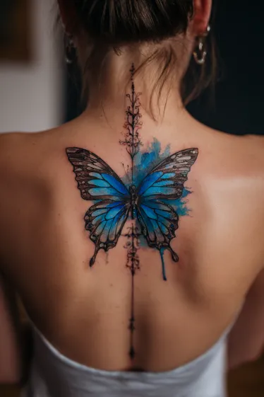 This striking back tattoo features a magnificent blue butterfly with intricate wing patterns, centered boldly on the spine. Behind the butterfly, a vibrant splash of watercolor in shades of electric blue creates a dynamic and artistic backdrop, giving the impression of movement and lightness. A delicate, ornamental line extends both above and below the butterfly, tracing the length of the spine and adding an elegant, elongated feel to the whole design.