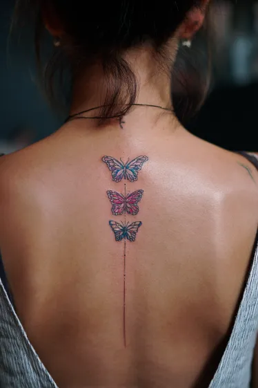 This sweet spine tattoo features a charming line of three delicate butterflies, each boasting its own unique splash of color. The top butterfly has soft blues and purples, the middle one bursts with lovely pinks, and the bottom one combines blues and greens, all connected by a fine, subtle line trailing down the spine. The slightly faded, watercolor-like effect on their wings gives them a really soft and ethereal appearance, making it feel like they re gently fluttering.