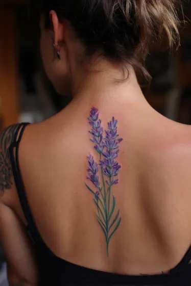 This charming tattoo showcases several stalks of vibrant lavender, blooming beautifully down the spine. The individual florets are depicted in various shades of purple, giving a soft and natural texture to each sprig, while the slender green stems and leaves add a touch of fresh realism. The entire design creates a wonderfully organic and flowing botanical statement that elegantly highlights the back s natural line.