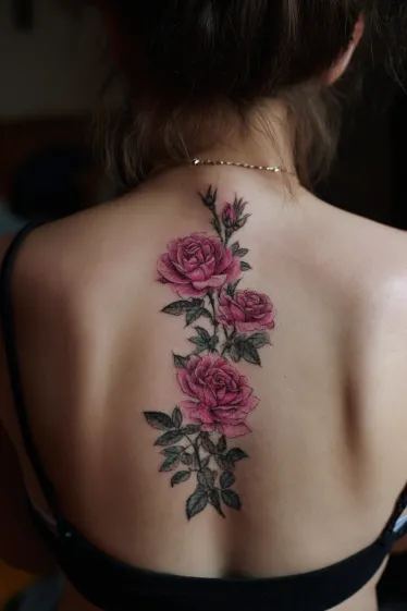 Oh my goodness, I just adore how classic and timeless this rose tattoo feels. The rich pinks of the roses are so captivating, and the way they flow down the spine is incredibly elegant and flattering. It s such a lovely way to express femininity and beauty, and I think it would make anyone feel absolutely gorgeous and confident with this stunning floral art.