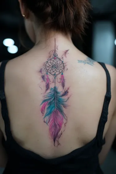 This enchanting tattoo features a beautifully intricate dreamcatcher at the top, complete with delicate webbing and tiny beads, gracefully positioned on the upper spine. Dangling from it is a cascade of soft feathers rendered in stunning shades of vibrant pink and a cool, tranquil teal, creating a gorgeous color blend. Subtle watercolor-like splashes and faint lines add to the ethereal and fluid movement of the design as it flows elegantly down the back.