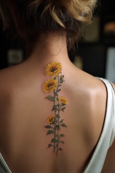 This absolutely cheerful spine tattoo features a vibrant trail of sunflowers, beaming with bright yellow petals and rich brown centers, elegantly arranged to grow upwards along the back. Each flower is depicted with lovely detail, and they re beautifully complemented by crisp green stems and leaves, creating a wonderfully natural and uplifting botanical design that brings so much warmth. It truly feels like a ray of sunshine permanently adorning the spine.