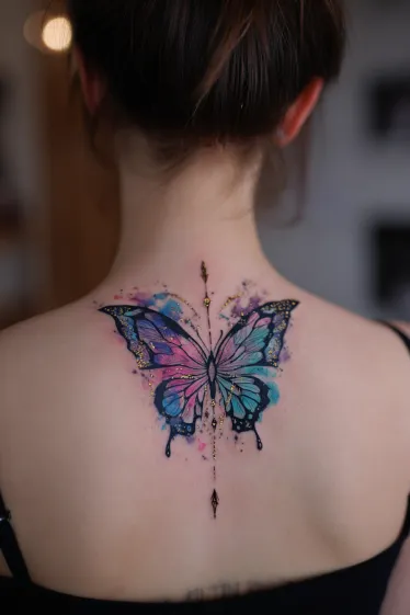 This enchanting spine tattoo features a vibrant butterfly, its wings painted in a gorgeous watercolor gradient of soft pinks and blues, truly capturing the eye. Behind the butterfly, artistic splashes of blue and purple watercolor create a dreamy, ethereal backdrop, making it feel like it s taking flight amidst a colorful cloud. Dainty golden glitter accents are sprinkled across the wings and surrounding splashes, adding a touch of magic, while a delicate line with tiny ornamental details elegantly extends along the spine, perfectly centering this whimsical design.