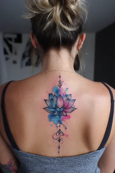 This stunning tattoo features a delicate lotus flower at the center of the spine, surrounded by beautiful splashes of watercolor in soft pink and blue hues. The intricate linework defines the flower s petals, adding a refined, feminine touch. The watercolor effect creates a dreamy feel, with the colors softly blending into one another, making the tattoo feel light and graceful. Tiny geometric shapes add a modern flair, drawing the eye down the spine and enhancing the overall symmetry of the design.