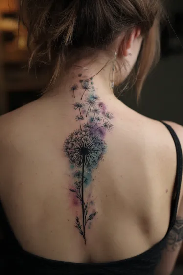I think this tattoo is simply magical. The mix of delicate linework and watercolor is such a creative way to represent something as simple yet profound as a dandelion. It has a soft, feminine feel that works beautifully along the spine. Plus, the colors give it a unique, artistic touch that feels refreshing and light. It s the perfect tattoo for someone who loves nature and wants something that feels both personal and elegant. The flowing seeds add a sense of freedom, making it a stunning choice for a tattoo that tells a story.