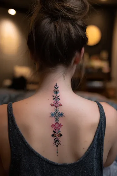 This eye-catching tattoo features a beautiful, symmetrical design composed of delicate geometric and stylized floral elements, all arranged vertically along the spine. It s a mesmerizing mix of soft pinks, gentle blues, and darker, almost black, outlines and accents, creating a rich tapestry of color and shape. The pattern is intricate and detailed, giving it a charming, almost textile-like quality that perfectly complements the natural line of the back.