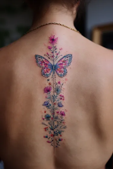 Whimsical Butterfly and Wildflower Spine Tattoo