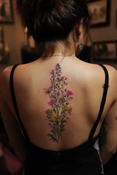 This delightful tattoo features a lush and colorful bouquet of wildflowers, gracefully arranged to trace the length of the spine. You can spot an array of blooms in soft purples, vibrant pinks, and cheerful yellows, all nestled amongst delicate green foliage. The variety of flowers and their subtle watercolor-like shading give the piece a wonderfully organic and natural feel, like a little piece of a meadow brought to life.
