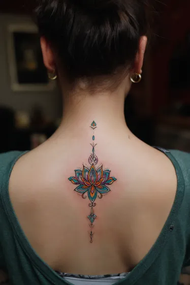 Colorful Lotus Spine Tattoo