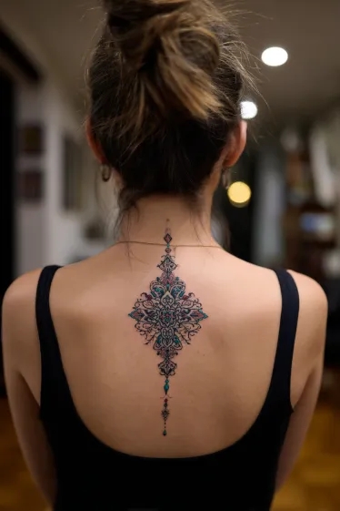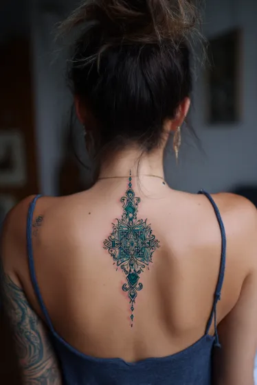 This tattoo is a stunning ornamental mandala placed right along the spine. The design features symmetrical patterns with intricate linework that flows vertically, giving it a perfectly balanced look. Shades of teal and dark green make the artwork stand out beautifully, while subtle hints of red bring a pop of contrast that feels both bold and elegant. The overall shape elongates the spine and draws the eye to the center, making it a statement piece without being overwhelming in size.