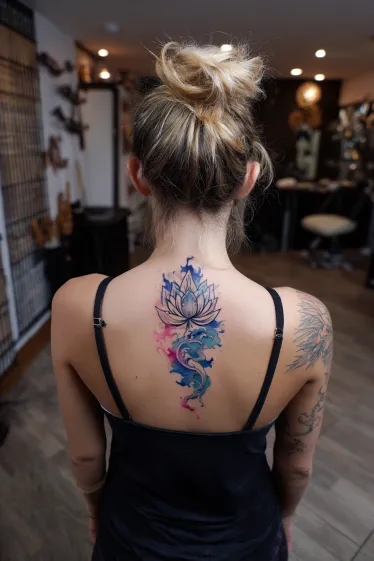This tattoo places a lotus flower at the upper spine, with petals outlined in fine black ink and filled with gentle shades of blue and purple. Beneath the lotus, watercolor splashes in pink, blue, and teal flow downward in an abstract trail, giving the design a soft, fluid movement. The mix of structured linework and free-flowing color makes it look balanced yet artistic.