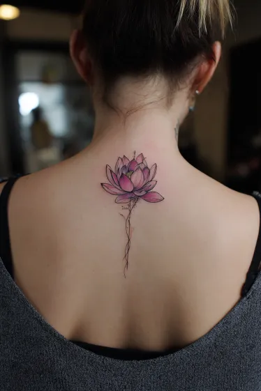 This tattoo shows a single lotus flower at the top of the spine, with soft pink petals fading into hints of purple. The stem extends downward in a fine, delicate line, giving the design a graceful vertical flow without overwhelming the back. The shading is gentle, making the flower look almost three-dimensional, as if it s blooming right on the skin.