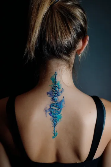 This tattoo creates the illusion of a spine made from abstract watercolor strokes in shades of blue, purple, and teal. The design flows vertically down the back, mimicking the shape of vertebrae with an artistic twist. The splashes of color give it a painterly feel, almost as if the spine itself was brushed onto the skin with soft strokes of watercolor paint.