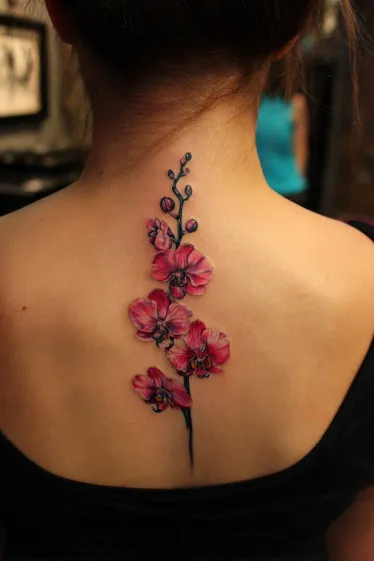 I think this tattoo is gorgeous because orchids always bring such a sense of sophistication. They symbolize beauty and strength, and I love how those qualities come through in this piece. To me, it feels timeless and feminine, and it s the kind of tattoo that instantly makes the back look like a delicate piece of art.