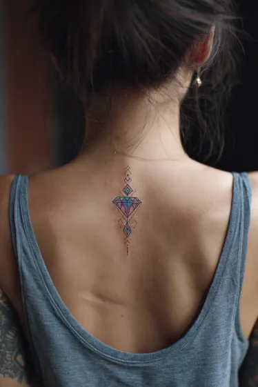 This tattoo shows a small diamond shape placed neatly along the spine, crafted with clean geometric lines and filled with shades of blue and purple. The design has a modern, minimalistic vibe, with smaller diamond accents above and below that help extend the flow vertically. The crisp shapes and vibrant colors make it stand out while still keeping the look delicate and refined.