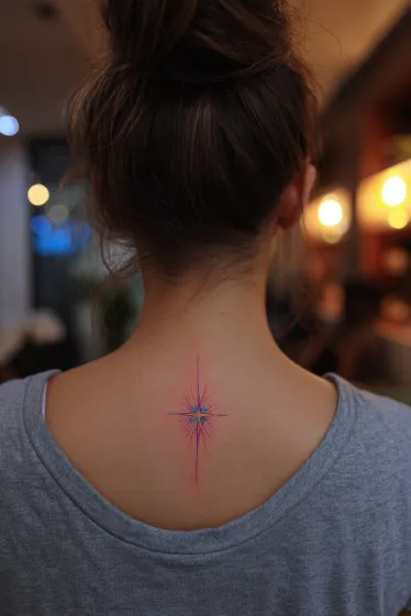 This tattoo is a radiant starburst placed neatly at the top of the spine. The design uses thin, precise lines in shades of pink and blue that cross outward, creating a glowing effect that feels both minimal and striking. The colored lines blend softly at the center, making the star look almost like it s shining from within.