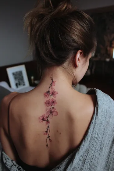 This tattoo flows gently down the spine with delicate cherry blossoms in soft pink shades. Each flower is detailed yet airy, with fine line stems that give the design a graceful, almost weightless feel. The blossoms are spaced just right, creating a natural rhythm that looks like they re drifting along the spine. It s feminine, romantic, and beautifully understated while still making a striking impression.