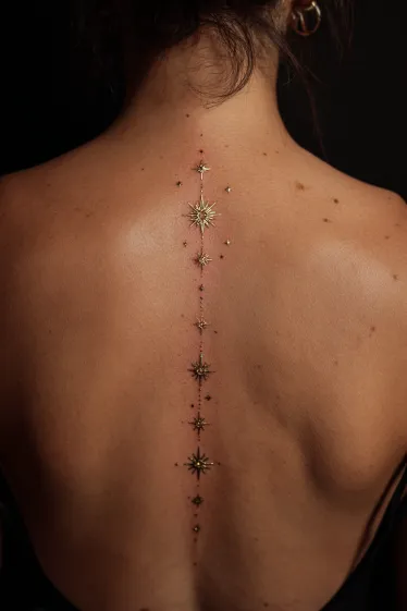 This tattoo features a delicate line of stars running down the spine, with larger radiant starbursts surrounded by smaller dots and sparkles. The golden tones give the stars a glowing effect, almost like tiny constellations scattered across the skin. The vertical arrangement follows the natural curve of the back, creating a celestial pathway that feels both elegant and mystical.