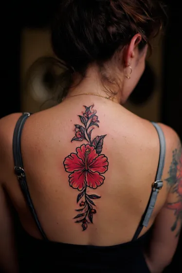 This tattoo features a bold hibiscus flower blooming at the center of the spine, with detailed petals shaded in vibrant red. The stem extends upward and downward with delicate buds and leaves, creating a balanced vertical design that follows the natural line of the back. The crisp outlines paired with rich colors give it a tropical, lively feel while still keeping the overall look elegant.