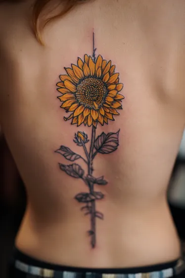 This tattoo features a tall sunflower stretching along the spine, with bold golden petals at the top and a slim stem lined with leaves trailing downward. The detailing in the center of the flower is intricate, giving it a lifelike texture, while the petals radiate warmth and vibrancy. The vertical placement of the stem works perfectly with the natural line of the spine, making the design feel balanced and graceful.