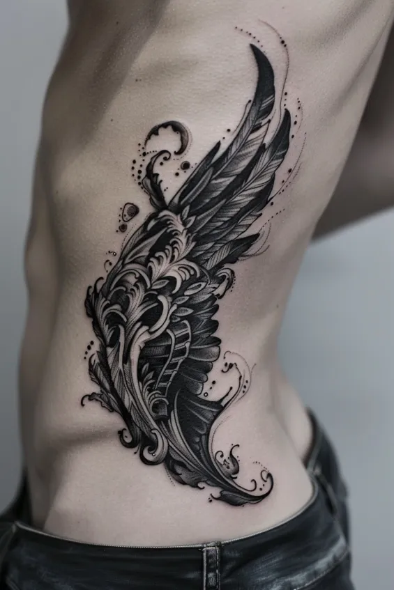 This breathtaking ribcage tattoo features a bold, blackwork wing with intricate ornamental details. The flowing design merges sharp featherwork with swirling filigree, creating a dynamic balance between strength and elegance. Dark shading and crisp linework add a striking depth, making the wing appear almost three-dimensional. Tiny dotwork elements give the piece a sense of movement, as if the wing is in mid-flight.