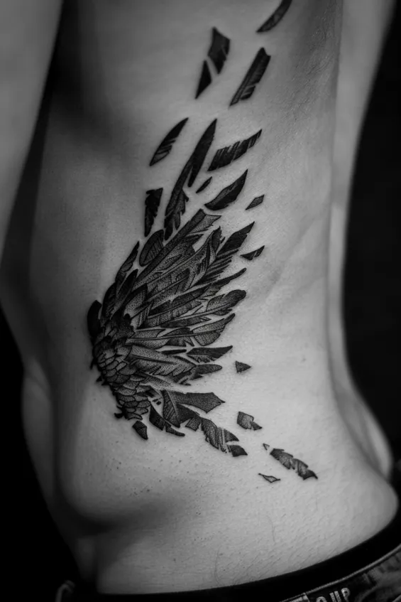 This striking ribcage tattoo features a beautifully detailed wing breaking apart into scattered fragments. The dark, bold linework and deep shading create a powerful contrast, making the design feel almost three-dimensional. The scattered shards drifting away add a sense of movement, as if the wing is dissolving into the air.