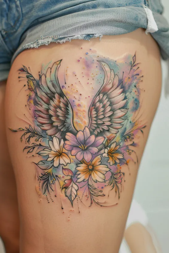 Vibrant Watercolor Wings and Floral Thigh Tattoo