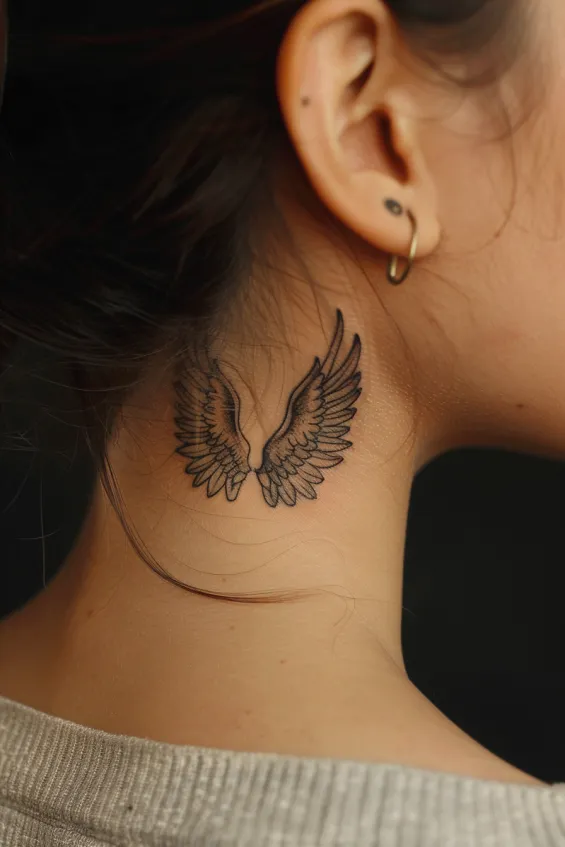This beautifully subtle tattoo features a pair of finely detailed angel wings resting just below the hairline on the nape of the neck. The crisp linework and soft shading give the wings a feathery, weightless effect, making them look as if they could flutter at any moment. The small size and precise placement make this design both discreet and effortlessly elegant.