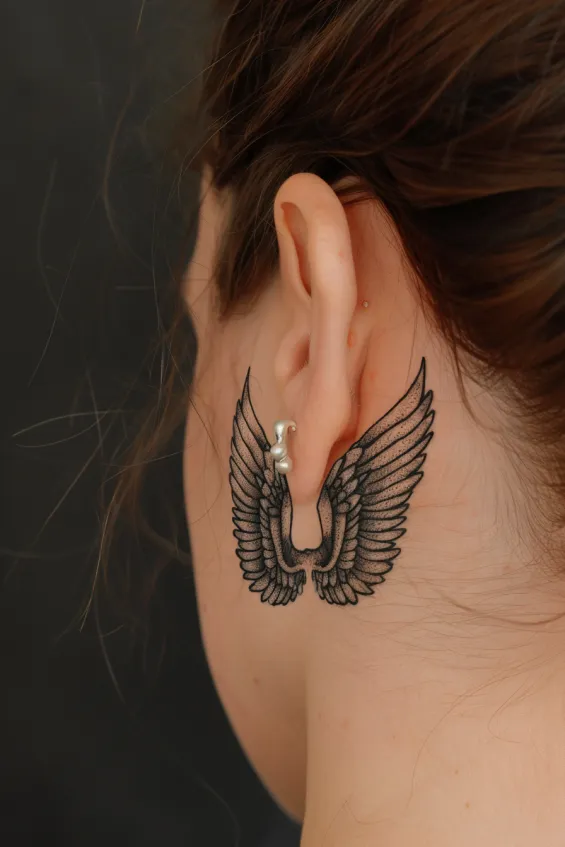 Elegant Wing Tattoo Wrapping Behind the Ear