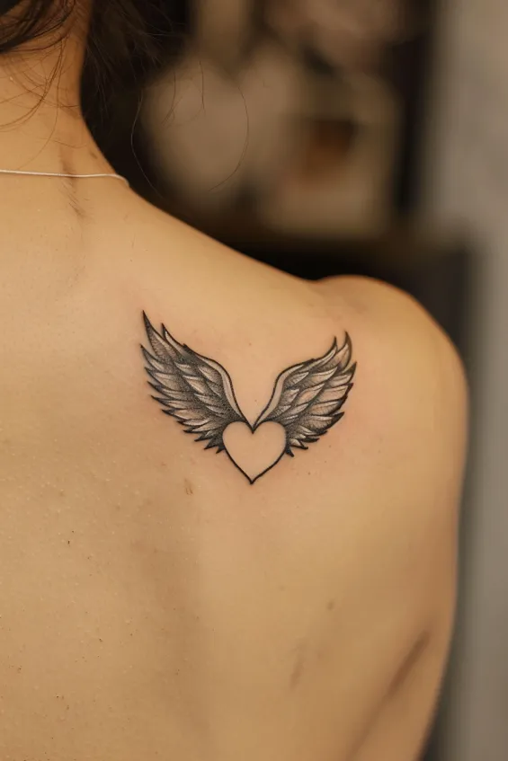 This charming shoulder tattoo features a beautifully simple winged heart, blending soft curves with delicate feather detailing. The fine shading within the wings adds depth, making them look airy and weightless, while the heart at the center keeps the design elegant and meaningful. Placed perfectly on the shoulder blade, it follows the natural shape of the body, giving it a balanced and graceful feel.