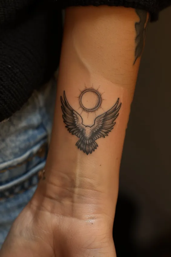 There s something truly mesmerizing about this design. It feels like a blend of divine protection and artistic beauty, wrapping the forearm like an inked piece of jewelry. The detailed symmetry and graceful flow of the wings give it an air of power and mystery. If you love tattoos that feel both regal and deeply symbolic, this one is a masterpiece.