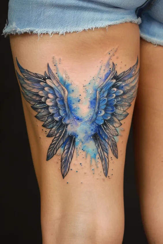 This dreamy thigh tattoo features a pair of beautifully shaded wings bursting with deep blues and cosmic hues. The soft watercolor background blends seamlessly into the skin, giving the wings an ethereal, almost weightless feel. Delicate splashes of white ink mimic the look of tiny glowing stars, making the entire piece feel like a portal to another world. The feathers have a rich depth, with darker tones adding contrast and a sense of movement.