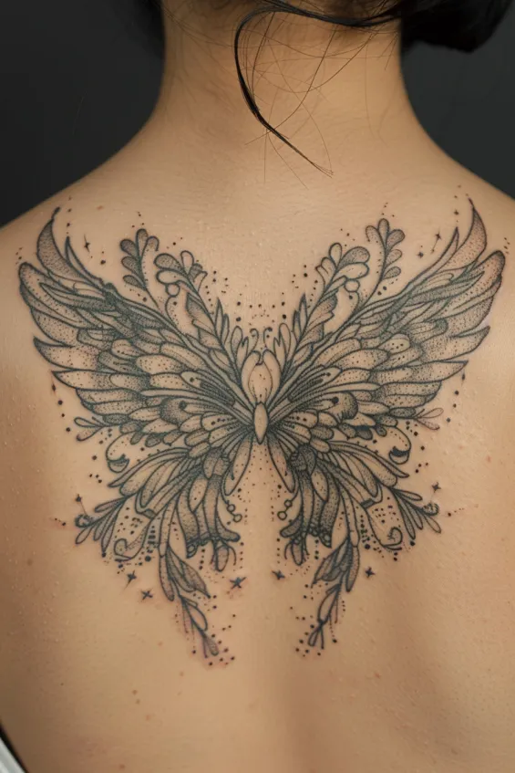 This enchanting back tattoo features a delicate pair of butterfly-inspired wings adorned with intricate linework and soft dot shading. The design blends organic feather-like details with elegant flourishes, creating a light and whimsical aesthetic. Tiny stars and subtle speckles surround the wings, adding to the dreamy, celestial feel of the piece.