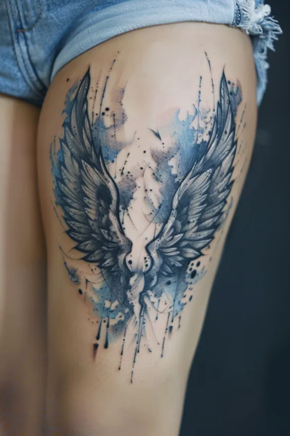 This mesmerizing thigh tattoo combines delicate angelic wings with an artistic watercolor splash effect. The wings are shaded with soft blacks and cool blues, giving them a striking contrast against the skin. The free-flowing ink splatters and abstract brushstroke details make it feel dynamic, as if the wings are dissolving into the air. The subtle human-like figure at the center adds a unique touch, giving the design an almost ethereal presence.