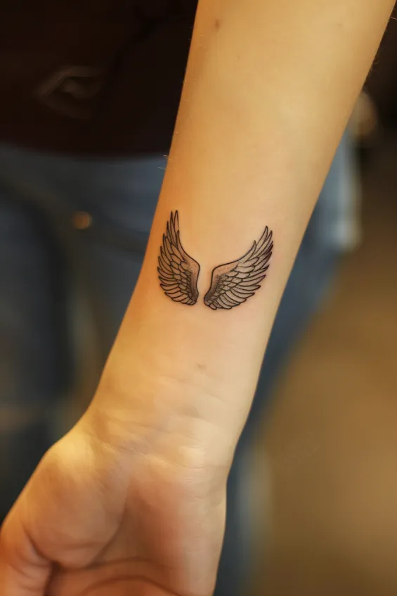 This delicate wrist tattoo features a simple yet elegant pair of angel wings, drawn with fine linework and subtle shading. The small size and clean design give it a minimalist charm, making it perfect for those who love subtle yet meaningful tattoos. Placed on the inner wrist, this piece feels like a personal reminder of freedom, guidance, or protection.
