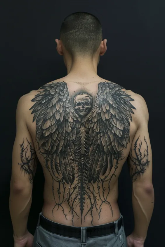 There s something strikingly powerful about this design. It carries an intense energy, balancing between the themes of life and death, freedom and fate. The way the wings, spine, and arms intertwine gives it a raw, almost mythical quality. If you re drawn to tattoos that make a bold, unforgettable statement, this one is nothing short of legendary.