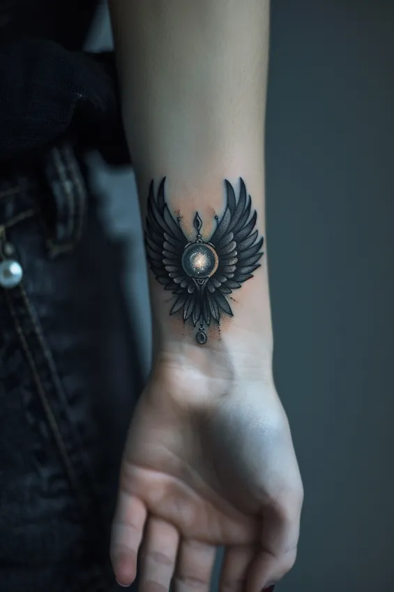 This beautifully crafted wrist tattoo features a pair of symmetrical wings framing an ornate, pendant-like centerpiece. The deep black shading gives the wings a bold, almost sculpted appearance, making them stand out against the skin. The intricate details within the pendant create an elegant, almost jewelry-inspired effect, adding a touch of sophistication and mystery to the design.