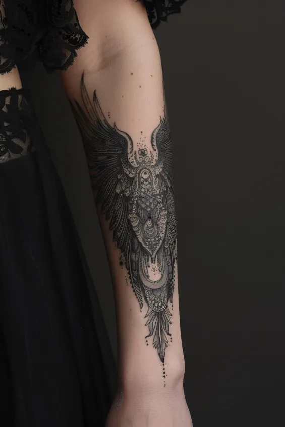 This breathtaking forearm tattoo features an intricately detailed winged figure with an elegant, ornamental design. The fine linework and rich black shading create a lace-like effect, adding depth and dimension to the piece. Decorative elements, including delicate dotwork and crescent moons, enhance the celestial and mystical energy of the tattoo.