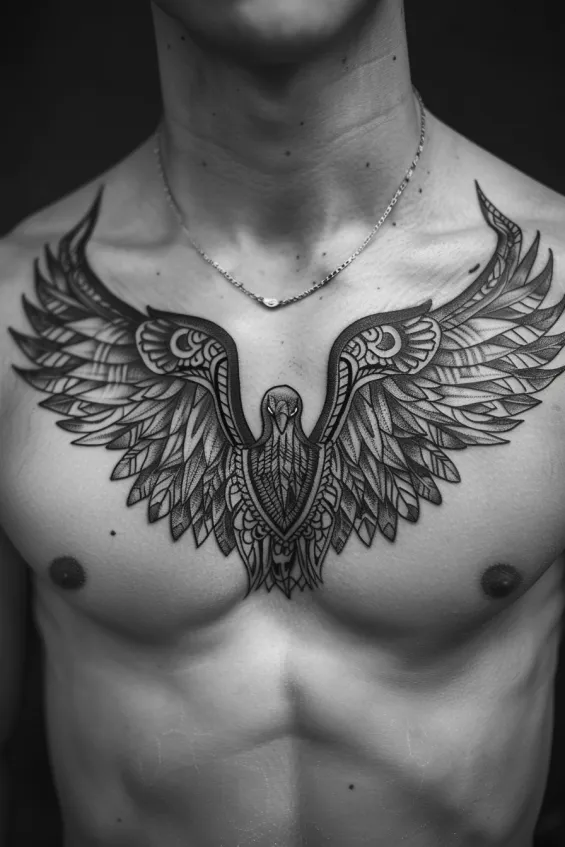 This stunning chest piece features a powerful set of outstretched wings, carefully inked to follow the contours of the body. The detailed featherwork creates a layered, realistic effect, giving the wings a sense of movement and depth. With a balanced design extending across the chest, this tattoo makes a striking statement while maintaining an artistic flow that complements the natural musculature.