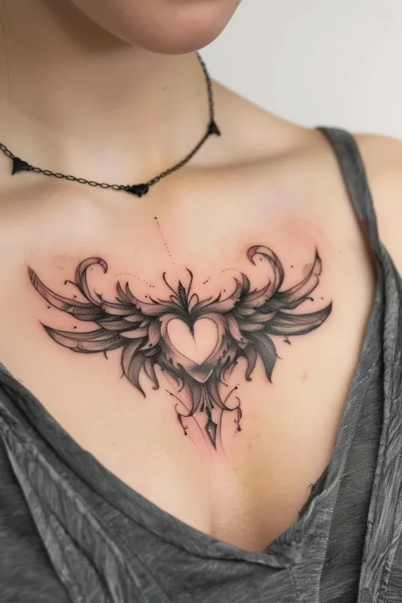 This stunning chest tattoo features a beautifully intricate winged heart design with elegant gothic flourishes. The wings extend outward with a mix of sharp and flowing lines, giving the tattoo an ethereal yet edgy feel. Soft shading adds depth, while delicate ornamental details give it an almost filigree-like appearance. The heart at the center acts as the focal point, making this design a perfect blend of romance and strength.